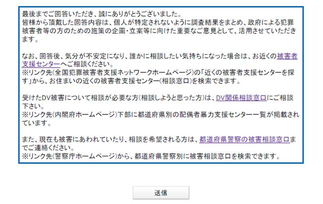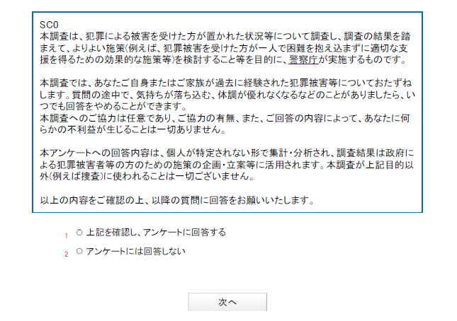 本調査は、第3次犯罪被害者等基本計画に基づき、被害類型別、加害者との関係別に、犯罪被害者等の置かれた状況について調査を実施し、犯罪等被害が心身の健康状態に及ぼす影響、主観的な回復状況とその要因に関する認識等を把握し、各府省庁の施策の企画・立案等に反映させることを目的とする。