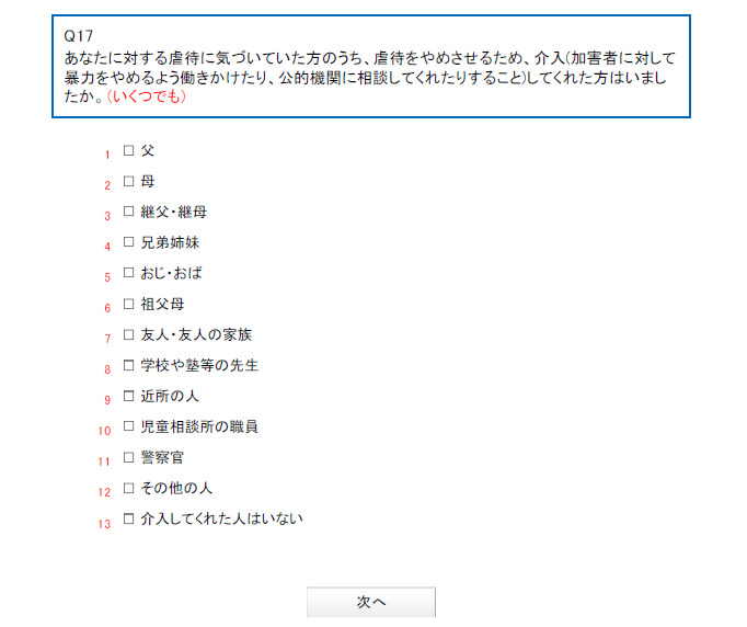 | 児童虐待 | 18歳になるまでの間に、同居する保護者から受けた、以下のような虐待。