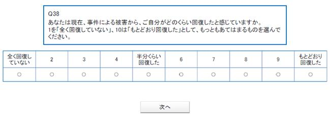 Q38(現在、事件による被害からどのくらい回復したと感じているか)で尋ねた、被害からの主観的な回復度を基に、回復に及ぼす要因の抽出とその影響を分析する。