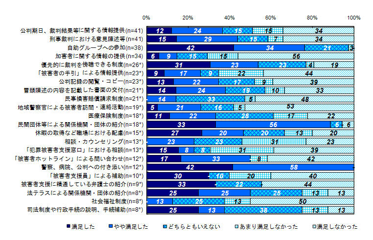 昨年度調査と比較しても、全体的な傾向に大きな違いはないが、昨年度調査では「自助グループ」や「事件発生直後からの付添い」に加えて、「被害者支援員による補助」や「司法制度や行政手続の説明、手続補助」等への満足度も比較的高くなっている。
