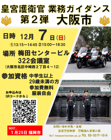 各説明会の詳細は、公式X【公式】皇宮警察採用担当でも確認できます。| ○令和7年11月29日(土) 13:30~15:30(受付13:15~) ○令和7年11月30日(日) ①10:00~12:00(受付9:45~) ②14:00~16:00(受付13:45~) ※チラシのQR又は、下記予約フォームからお申込みください。 《予約フォーム》 |