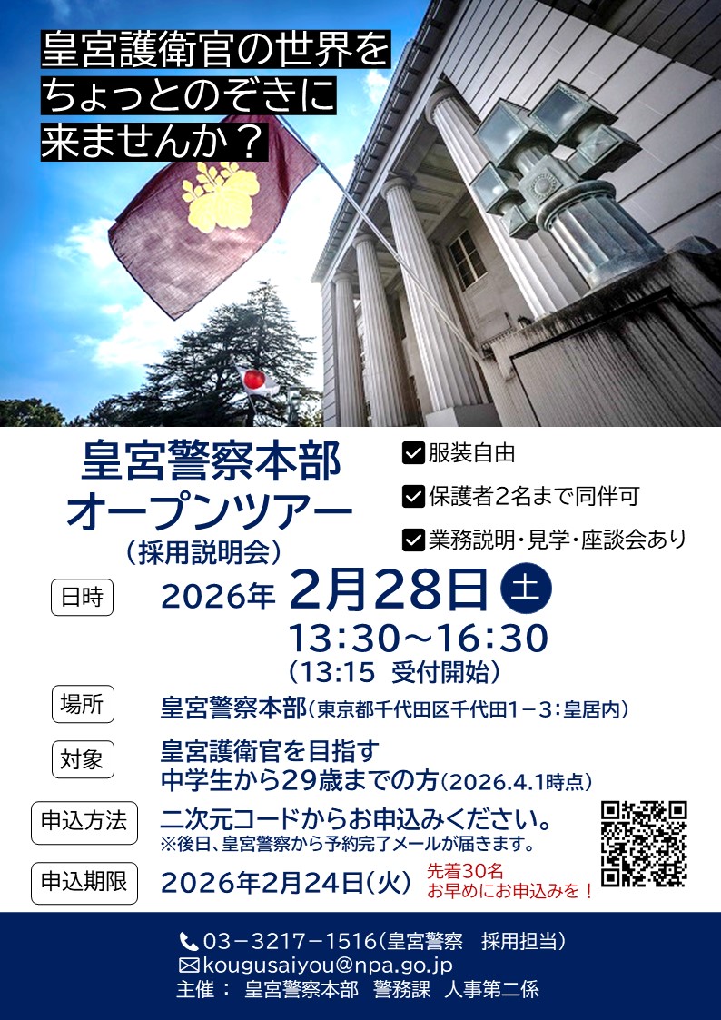 「皇宮警察本部オープンツアー」 開催場所:皇宮警察本部 東京都千代田区千代田1-3 ※申込者多数につき、定員を60人に増員いたしました。 ※満員御礼につき募集を終了しました。 |