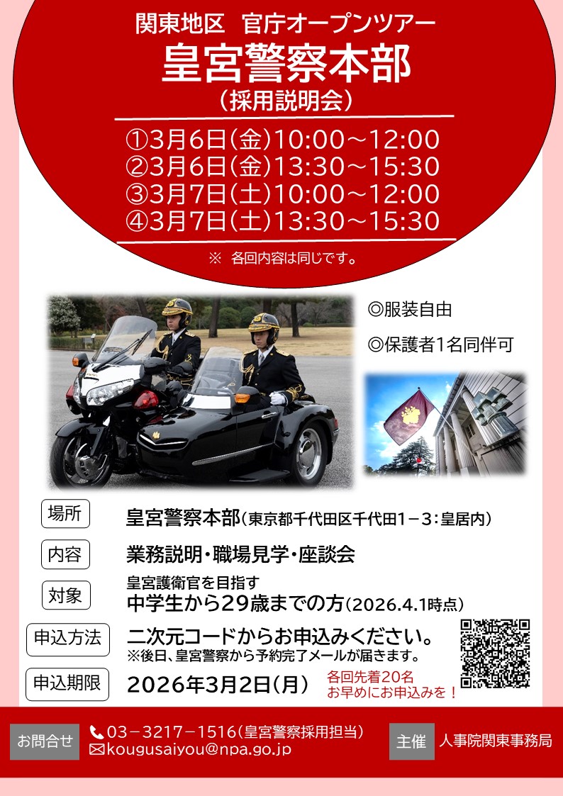 各説明会の詳細は、公式X【公式】皇宮警察採用担当でも確認できます。| ○令和8年3月6日(金) ○令和8年3月7日(土) ※チラシの二次元コード又は、下記予約フォームからお申込みください。 《予約フォーム》 |